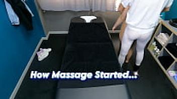 On the massage bed, the masseuse fingered her pussy and ground Dick on her ass.