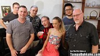 An amateur German slender woman who enjoys bukkake and creampie gangbang orgy