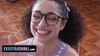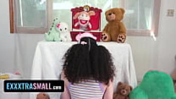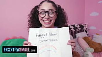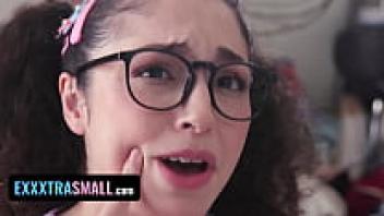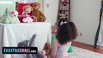 An extremely small pigtail cutie wearing fishnets gets her pussy stretched out.