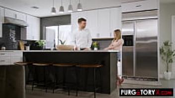 In the kitchen, a gorgeous blonde is infatuated.
