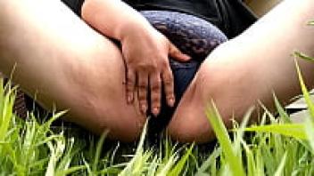 Outside, the obese mother-in-law pooped through her new underwear while spreading her legs wide.