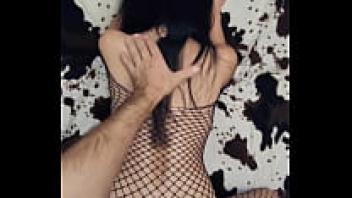 slender brunette wearing fishnet stockings, adored by a friend in the doggy style