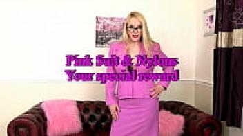 Lucy Gresty, a gorgeous stripper, wearing pink trousers and a pair of glasses