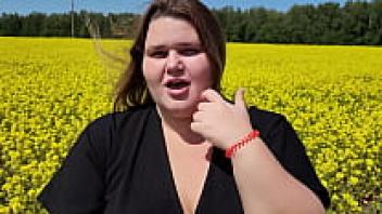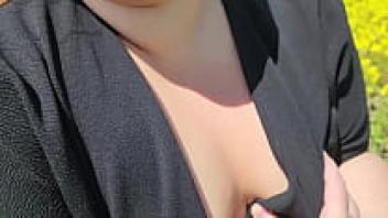 A plump beauty with large tits and juicy nipples gives a gorgeous point-of-view outside blowjob while playing with sperm.