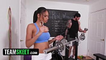 Smoking hot babe who enjoys showing off her gorgeous big tits at the gym with a fierce body