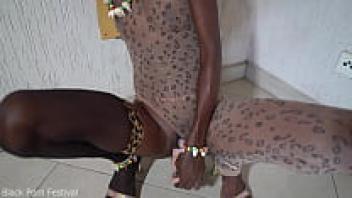 Ebony babe masturbating alone while sporting panther-printed underwear