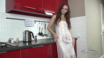 Susanna, who is slender and attractive, strips in the kitchen and massages her hairy pussy until she cums.