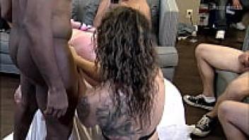 In an interracial orgy, a handcuffed MILF has her tight pussy drilled.