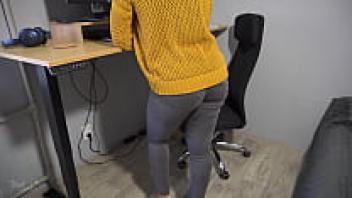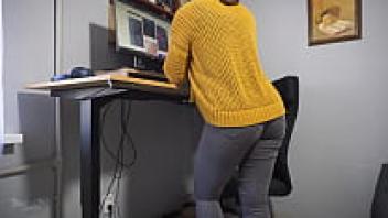 A gorgeous secretary wearing tight jeans flashes her ass with a noticeable pant line.