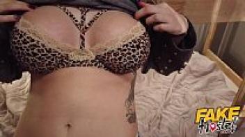Fake Hostel - Super Hot Redhead Big Busty Woman with tattoos and massive natural tits seduces French females cheating boyfriend after he cums in her panties, resulting in steamy threesome with orgasms and cumshot.