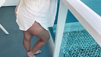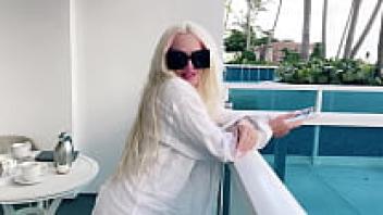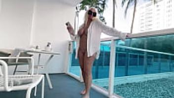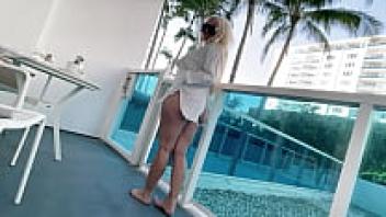 Playing with her pussy on a public hotel balcony, a blonde big-tit babe