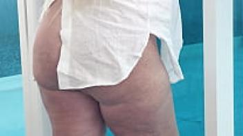 Outside, the obese mother-in-law pooped through her new underwear while spreading her legs wide.