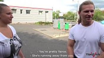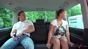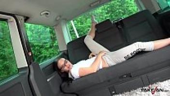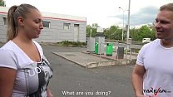 On the street, a chubby blonde with enormous breasts was persuaded to fall in love with a van.