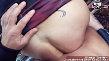 A car tows a tiny, German-blond street hooker for outdoor sex