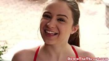 Babe in a deepthroat bikini gagging on a dick