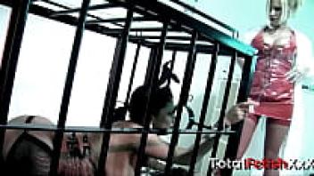 Lesbian Domina with Teen and Strap-On during a Rough Latex BDSM Bondage Session
