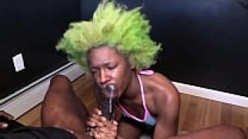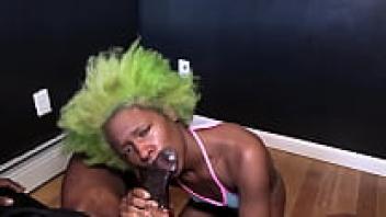 While deep-throating BBC Sloppy for a facial and throatpie, this attractive, slender, ebony babe wearing glasses shows her ass, toes, and soles in the mirror.