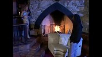 A long-haired man with wavy hair enters a lovely mocha floozie by the fireplace.