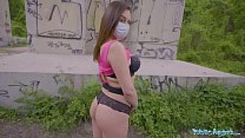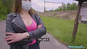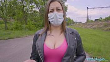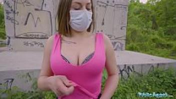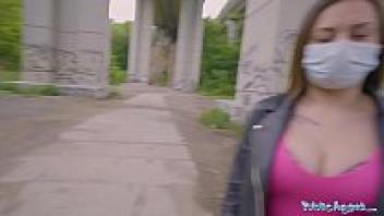 A lovely, sweet teen with big natural breasts is loved by a public agent wearing a face mask.