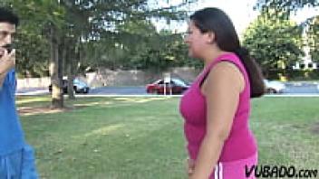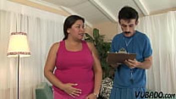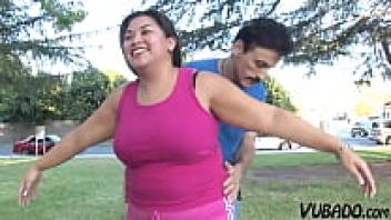 In her first sex video, a fat brunette