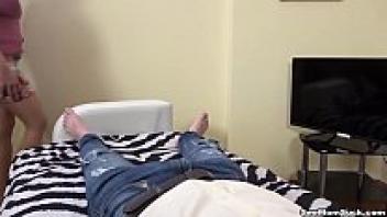 Euro Step mother demonstrates her son's big dick by sucking him off of the table.