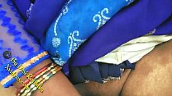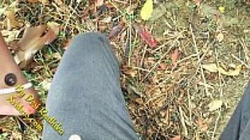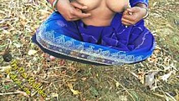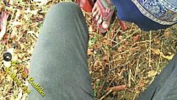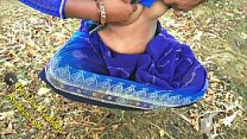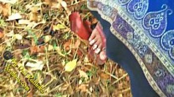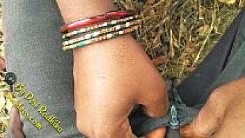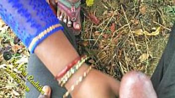 Desi Radhika, an Indian village woman with a naturally hairy pussy, engaging in outdoor sex