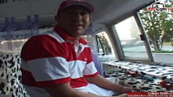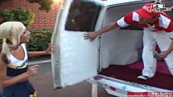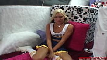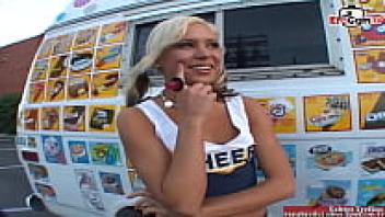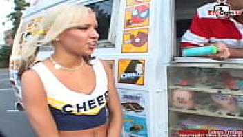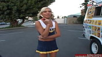 Teenage cheerleader who is petite and blonde is picked up for sex in a car.