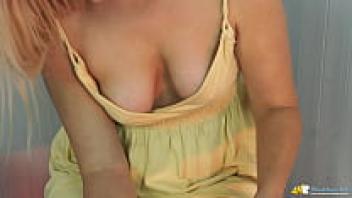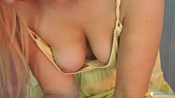While you wank your cock, a gorgeous British babe teases you with her cleavage and large nipples.