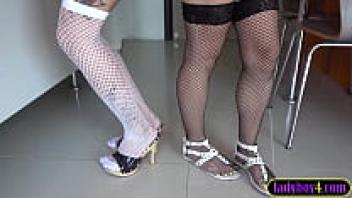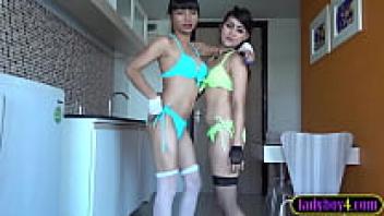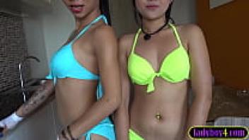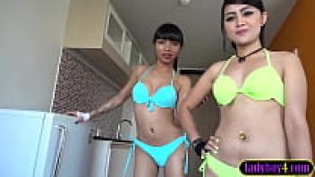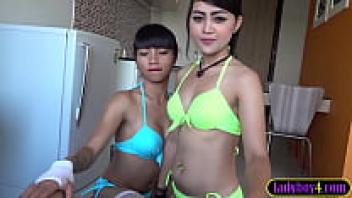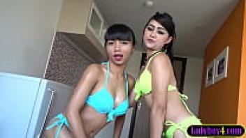 In this POV threesome video, a ladyboy and a girl partner up on a massive cock.