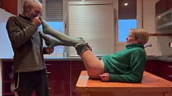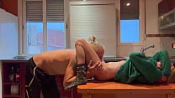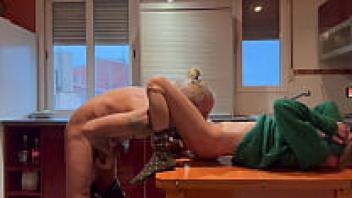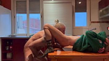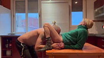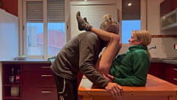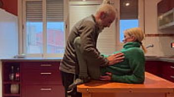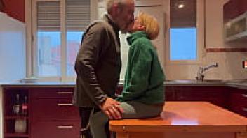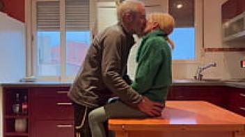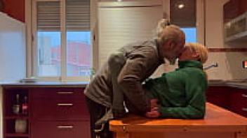 On the kitchen table, the neighbor and the little blonde are in love with each other.