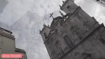 Natalia, decked out in a pair of tight leggings, strolls down the street.
