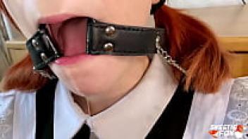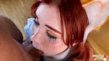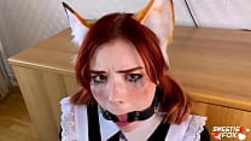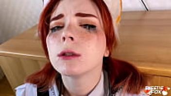 Sweetie Fox in uniform gives a deep, sloppy blowjob while wearing glasses.