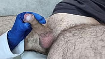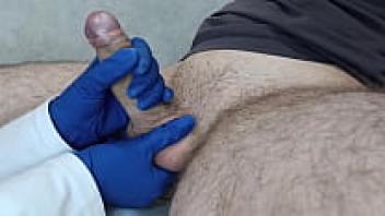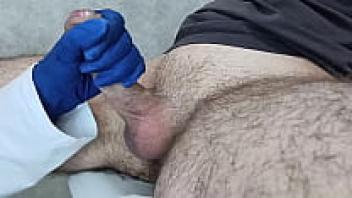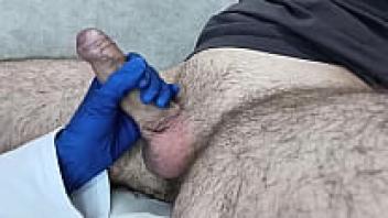 massage of the prostate. The attractive nurse jerks off the patient's dick while massaging the prostate. Cumshot of client cock. a lot of sperm. Milf physician