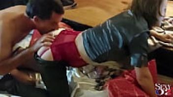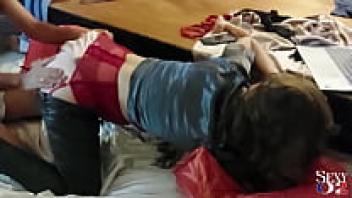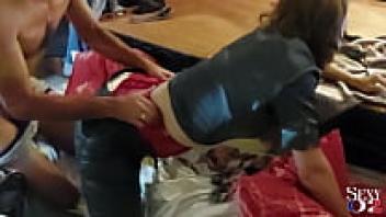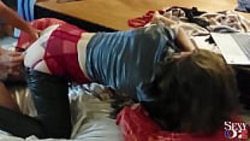 1840 (01): French amateur babe, leather pants, satin grey shirt, satin black underwear, garter belt, stockings, heels, blowjob, and rimming