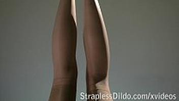 A mature milf riding a girlfriend in stockings bounces on a strapon, ripples her fat buttocks, and rattles her large breasts. Lesbians, btw.