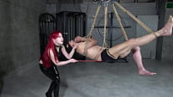 Femdom girl took advantage of her slave by tying him to the bed and used him as a slave.