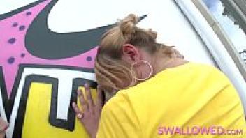In her gloryhole, a gorgeous blonde babe consumes cum.