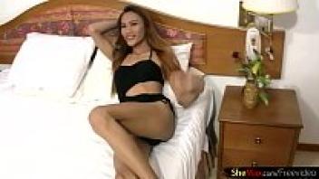 Teasing on the bed is enjoyable for a smiling ladyboy wearing black underwear.