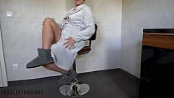 Projectfundiary: A plump housewife wearing a fluffy bathrobe and Ugg boots gets a massive cumshot on her fat ass