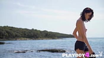 Scarlett Sage, a petite adolescent model, performs a solo striptease for Playboy in a pub.