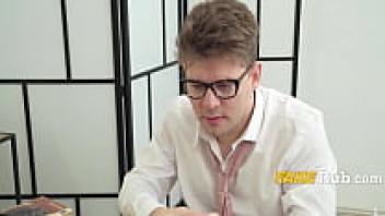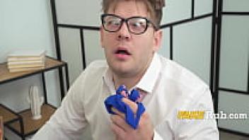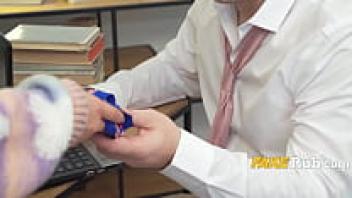 In the classroom, a lecturer jerks on college girls.