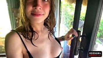 An amateur couple having sex in public on the veranda