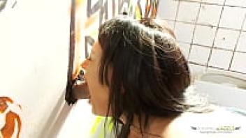 In the public restroom, a hard cock makes a kinky girl happy.