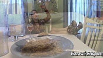 Kelly, a housewife, is seen sucking her cock in a furious manner under the table.