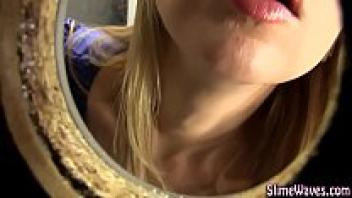 Elsa Jean, a tiny cutie, fingers her hairy pussy.