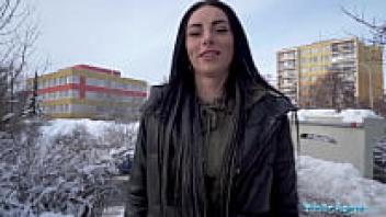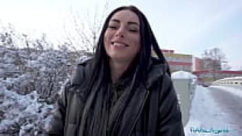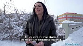 In public, Public Agent Blue-Eyed Babe sucks a massive, fat dick in the snow.