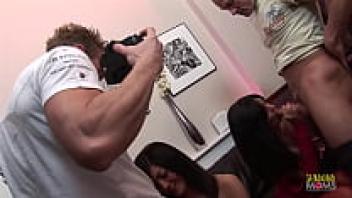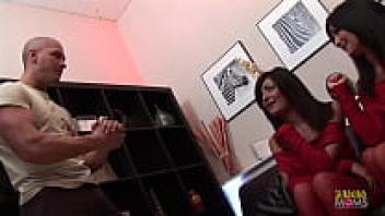 When a milf brunette couple shares a penis in a threesome, their enormous natural breasts seem stunning.