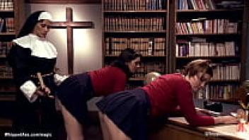 Sexy students get whipped by a lezdom nun.