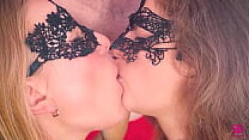 Eye-deprived blonde and brunette giving one guy a handjob and blowjob | chatting filthy | cum in eyes | POV FFM THREESOME