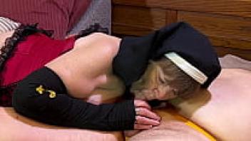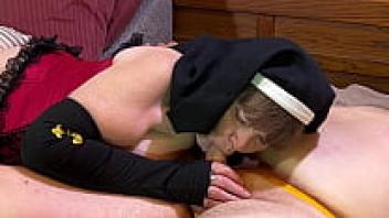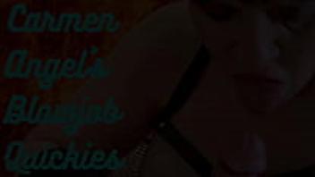 Carmen, a gorgeous brunette with short hair, blows his cock.